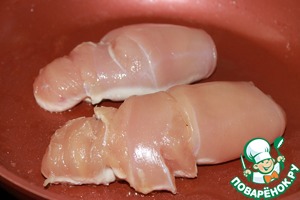 Грудки свернуть плотными рулетиками. На сковороде разогреть масло, выложить в него грудки и и готовить на среднем огне 10 минут переворачивая. Сильно зажаривать не нужно!!! Влить 250 мл воды, закрыть сковороду крышкой и продолжить приготовление еще 10 минут.