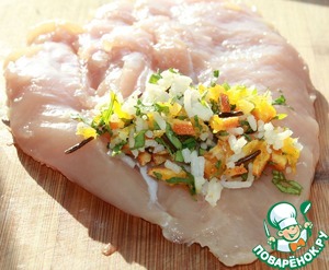 Куриные грудки промыть, обсушить и разрезать книжкой. Выложить на них рисовую смесь
