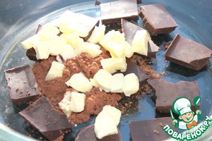 Для соуса в посуду с толстым дном добавить какао, нарезанное кубиками сливочное масло, шоколад и 125 мл горячего бульона в котором тушились грудки. Хорошо перемешать, посолить, поперчить. Массу довести до кипения, постоянно помешивая, и готовить 2 минуты. Соус снять с огня и хорошо взбить венчиком. До подачи соус держать на вод бане, чтобы не остыл.