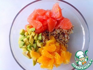 В салатник положить киноа, кусочки апельсина и грейпфрута, кубики авокадо. Перемешать.
