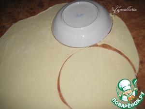 В центр каждого круга выложить по 2 ст. л. приготовленной начинки, скрепить противоположные края теста, оставляя в центре отверстие. -