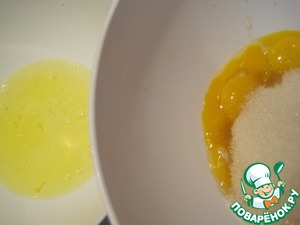 Все продукты должны быть комнатной температуры. Духовку разогреем до t 170-180 градусов. Отделим желтки от белков. Желтки, сахар и ванильный сахар взобъём в пышную светлую массу.