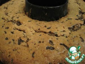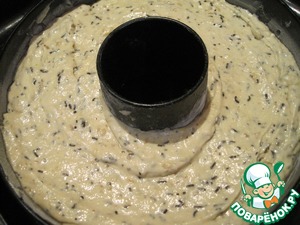 Разъёмную кольцевую форму (26 см диаметр) смажем сливочным маслом и присыплем мукой. Выложим тесто в форму и отправим в разогретую духовку выпекаться в течении часа или до сухой шпажки.