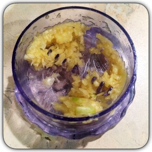Давим зубчики чеснока на чеснокодавке или режем, или трем на мелкой терке. Кому как больше нравится, у меня вот такая штуковина есть. Ужасно неудобная, но я пытаюсь к ней приноровиться. Выкладываем чеснок в щи.