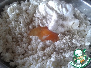 Готовим начинку. Разминаем фету, добавляем яйцо, йогурт и черный перец.