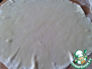 Отщипываем меньший кусочек теста и раскатываем меньшего диаметра круг. Укладываем его в центр большого круга, смазываем маслом.