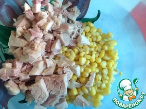 С кукурузы слить лишнюю жидкость. Мелким кубиком порезать куриную грудку
