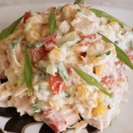 Салат заправить майонезом, перемешать. Сверху украсить зеленый луком.