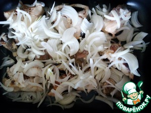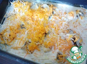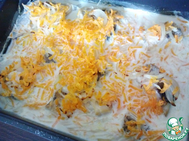 Обжаренную рыбу выложить в один слой в форму для запекания. Сверху распределить нарезанный лук.