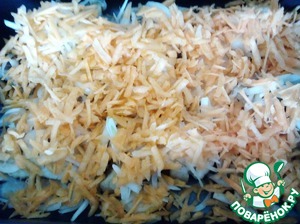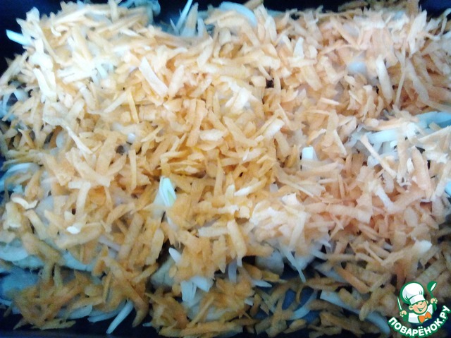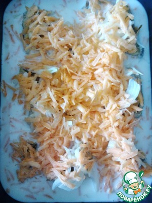 Поверх лукового слоя на крупной терке натереть морковь, равномерно распределить.