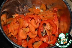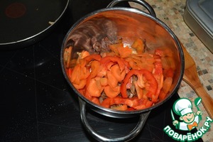 (К баранине) Добавляем воду 200 гр. (кому как нравится), зиру перед тем как кидать лучше размять большим пальцем в ладошке, готовый томатный соус, картофель и морковь, перец жгучий, болгарский перец, лавровый лист и ставим на средний огонь. Тушим до готовности картофеля.
