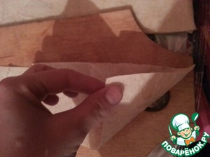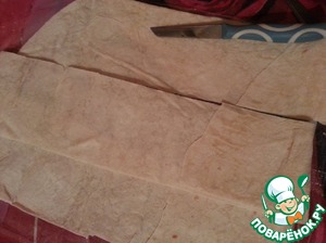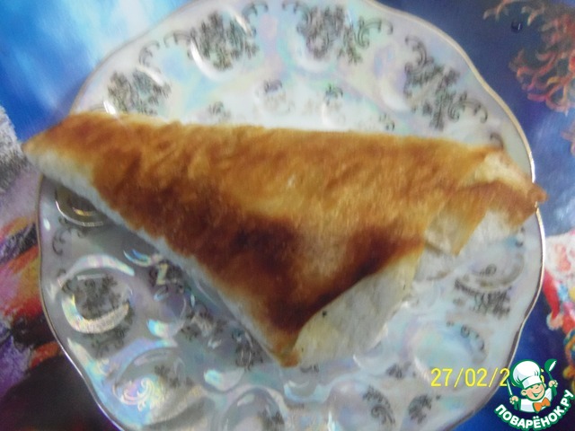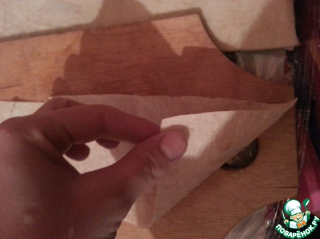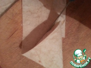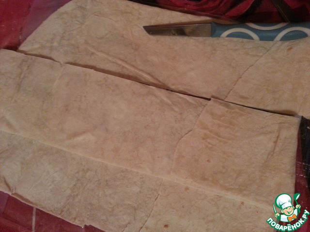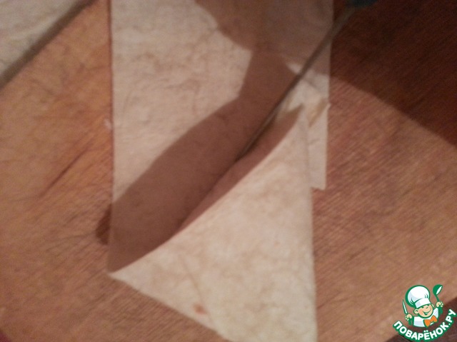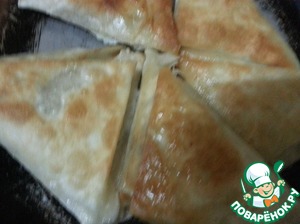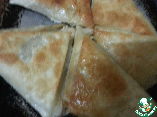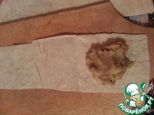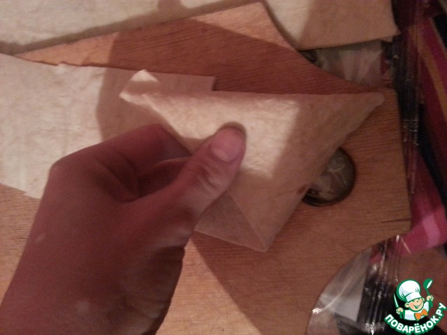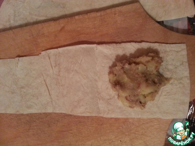Лаваш я разрезала по длине на 3 части, полосочки получились 11х39см. Полоску сую под кран, смачиваю, раскладываю на столе, начинку кладу ближе к уголку (у автора -в центре), уголок с начинкой загибаю на полосочку косынкой и заворачиваю косыночку дальше, (как мы в детстве фантики складывали на уголок). Последний виток смазываю яйцом для скрепления и весь пирожок сверху, укладываю на сковороду обжаривать.