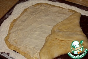 Раскатать тесто в квадрат или прямоугольник. Намазать сверху сливочный плавленый сыр.
