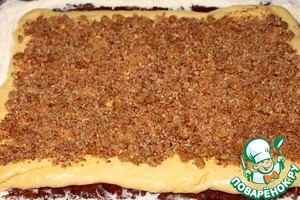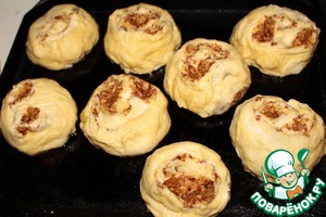 Выложить начинку. Свернуть тесто в рулет и разрезать на 8 частей.