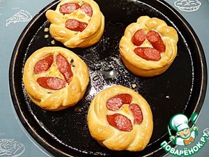 Выкладываю на начинку кусочки нарезанных колбасок.