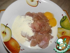 к куриному филе добавить желтки (белки убрать в холодильник), затем добавить манную крупу, мускатный орех и остальные специи, влить немного молока -
