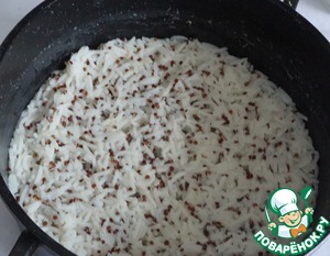 • Небольшими порциями добавляйте к яйцу рисовую начинку, продолжая взбивать смесь.