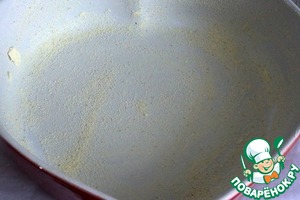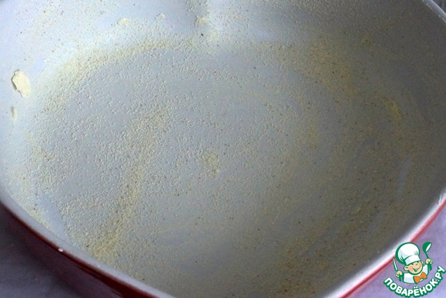 • Форму для выпечки смазать маслом и посыпать манкой или панировочными сухарями.