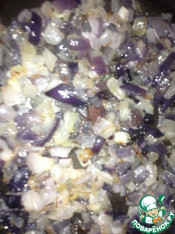Очищенные, порезанные крупными кусками, шампиньоны обжарить на оливковом масле. Посолить, поперчить. Добавить порубленный репчатый лук, обжарить. (Лук можно обжарить и отдельно, потом соединить с грибами)