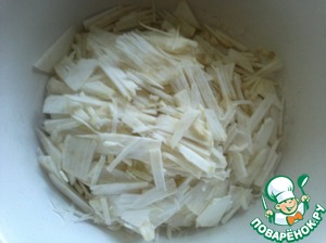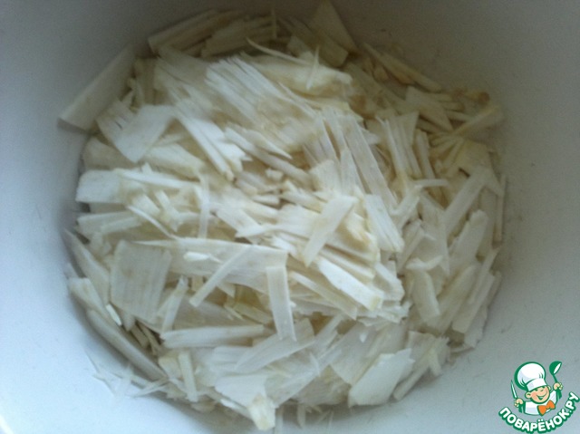На первый слой выложить тертый сельдерей, слегка присолить поперчить и также промазать смесью сметаны с майонезом. Посыпать сушеным чесноком. Можно посыпать мелко порубленным обыкновенным чесноком. Вкус готового блюда будет более острым, но это на любителя.