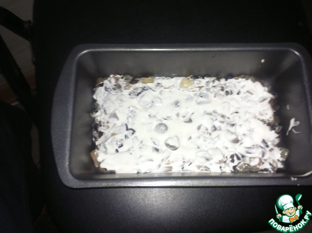 В посуду для запекания выложить первый слой: грибы с луком. Промазать смесью майонеза со сметаной. Можно присолить, но я этого не делаю, так как у меня все не любители излишней соли. Слегка поперчить.