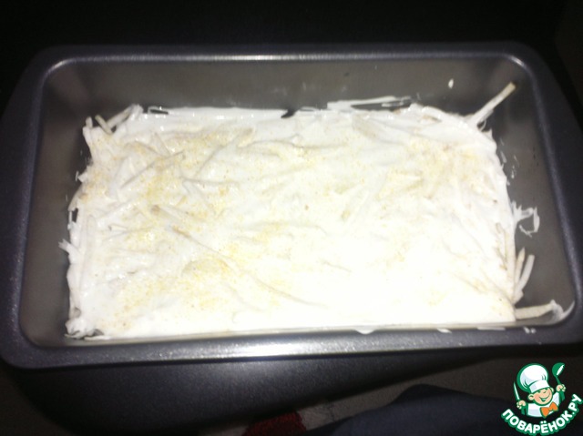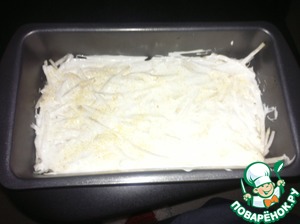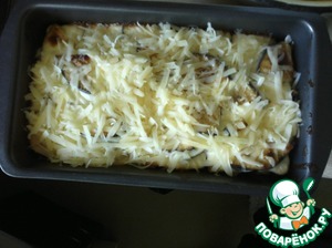В разогретую до 180*С духовку поместить нашу форму. Запекать примерно минут 40, в зависимости от вашей духовки. За 5 мин. до готовности достать форму и присыпать тертым твердым сыром типа пармезан. Количество сыра по вашему вкусу. Кому не нравится плавленный сыр, можно этого и не делать.