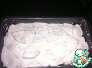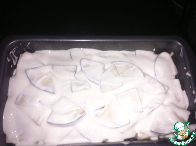 Последний слой - нарезанные баклажаны. Их также промазать хорошенько остатками майонеза со сметаной.
