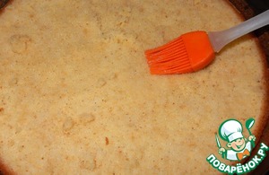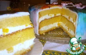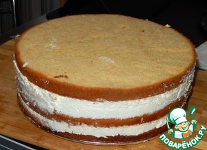 • Так как торт делался под покрытие мастикой, сборку осуществляла в той же разьемной форме в которой выпекались кожи. Корж пропитала сиропом от ананасов.