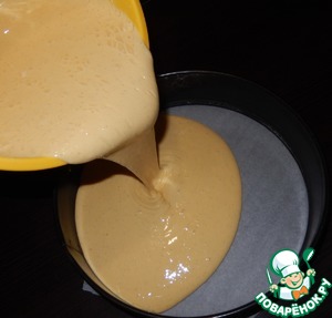 • Дно формы застилаем пергаментом, бока я не смазываю ничем так привыкла. Выливаем темто в форму и ставим выпекаться в разогретую духовку.