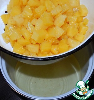 • Ананасы перекладываем в друшлаг, дабы сироп был отдельно от кусочков.