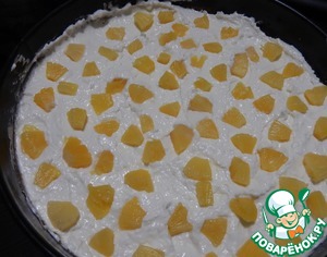 • Затем выложила половину крема и сверху половину кусочков ананаса, положила следующий корж, пропитала и закрыла кремом и ананасами. уложила верхний корж. и только пропитала его не много. Затем накрыла торт большой разделочной доской на нее положила груз в виде 2кг. круп и отправила в холодильник застывать. В моем случае на ночь.