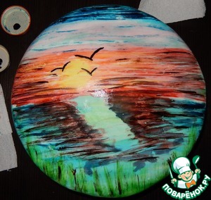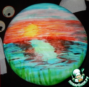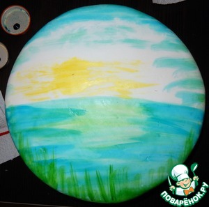Разводим немного желтого голубого и зеленого красителя. Сначала определяем наше солнышко красим его желтым и делаем размыты свет в стороны. Разведенным синим прорисовываем воду и некоторые части неба. Зеленым рисуем подобие камыша.