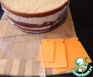 Инструменты для выравнивания торта совсем не хитрые. Желтые- это набор пластиковых шпателей, купленный в строительном магазине и пластиковая линейка с прямым углом.