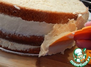 Вот такой торт получается у меня после первого слоя крема. Затем ставим его в холодильник остывать на пару часов. Крем должен застыть. Для моего торта хватило и такого выравнивания. (Для более сложных работ я ровняю торты более тщательно. Тонким слоем еще раз покрываю весь торт, снова ставлю в холодильник, а затем заглаживаю поверхность горячим ножом.)