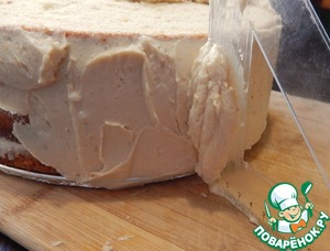 Для выравнивания я использую обычный масляный крем, сливочное масло плюс сгущенка. Масло комнатной температуры взбиваем миксером постепенно добавляя сгущенку. Крема всегда делаю с запасом так как ситуации разные бывают. При помощи маленького шпателя наносим крем толстым слоем на торт.