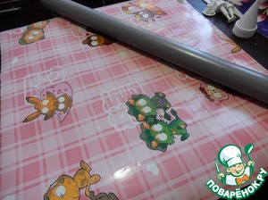 Когда торт застынет, готовим все для раскатывания мастики, у меня для этого приспособлена салфетка клеенчатая плотная размером 60х70 см. И обрезок пластиковой трубы вместо скалки длинной около 70 см. Маленькой скалкой раскатывать большие листы мастики неудобно. Раскатываю мастику в пласт толщиной 4-5 мм.