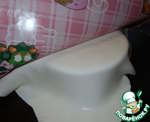 Складки с боков выгоняю на свободный край мастики, верх хорошенько разглаживаю утюжком пластиковым, потом выглаживаю бока и обрезаю лишнюю мастику. Убираю опять в холодильник на часик.