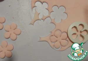 Цветы я делала двух размеров побольше более взрослые и светлые и поменьше, те что только распустились и более насыщенного цвета. Большие основу я делала на столе, раскатала мастику самую бледную толщиной около 3мм, вырубкой заготовки сделала.
