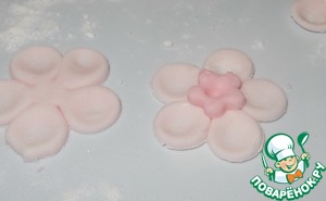 Маленькой пятилепестковой вырубкой из более насыщенной мастики делаем сердцевину цветка и приклеиваем ее в цент заготовки.