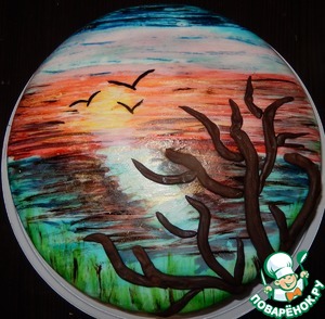 Смешала белый краситель и серебряную пудру капнула туда водки и немного нанесла на блик на воде. Золотым порошком присыпала совсем чуть-чуть закат и водную поверхность. Для веточек взяла мастику и покрасила ее коричневой краской, скатала колбаски разных размеров и уложила на торт в виде куста, затем немного приплюснула их пальцами и на несла штрихи, стеком, можно использовать зубочистку.