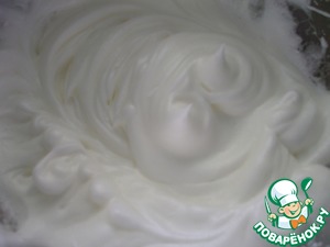 Делаем итальянскую меренгу. Начинаем взбивать 35 гр белка в небольшой миске. Повторяю, взбиваем до мягких пиков и до той стадии, когда жидкого белка на дне миски не остается. Вводим в три приема 12,5 гр сахарного песка.) хи-хи! -