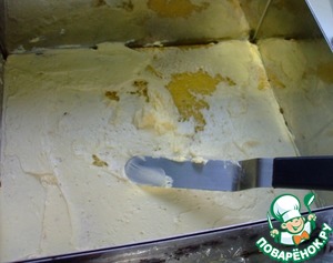 Торт я обычно собираю в рамке. Так выходит и лучше и ровнее слои. Итак, нижний корж мы помещаем шоколадной стороной книзу, на основу, застланную пищевой пленкой. Роль основы у меня играет небольшая прямоугольная металлическая пластинка, размеры ее вполне позволяют в дальнейшем втиснуть торт в морозилку для заморозки. Пропитываем бисквит сиропом. Как я уже где-то писала, холодный корж лучше всего пропитывать теплым сиропом. Так что, если надо я чуть подогреваю сироп в микроволновке. Тонким слоем (не более 2-3 мм) равномерно наносим лимонный крем с помощью спатулы.