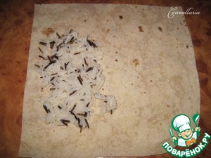 На каждую часть лаваша, ближе к краю, равномерно распределить сначала рис. -