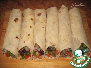 Теплая закуска из лаваша с сочной островатой начинкой из обжаренного фарша, красной фасоли, риса и овощного салата, с добавлением чеснока и перца чили.