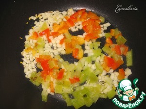 В глубоком сотейнике разогреть растительное масло, добавить мелко нарезанный чеснок и болгарский перец. Обжарить в течение 1 минуты.