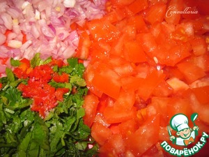 Помидоры нарезать небольшими кубиками, репчатый лук и перец чили (без семян) мелко накрошить.
