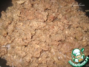 В сковороде на сильном огне, периодически помешивая, обжарить фарш до готовности (пока вся жидкость не выпарится).