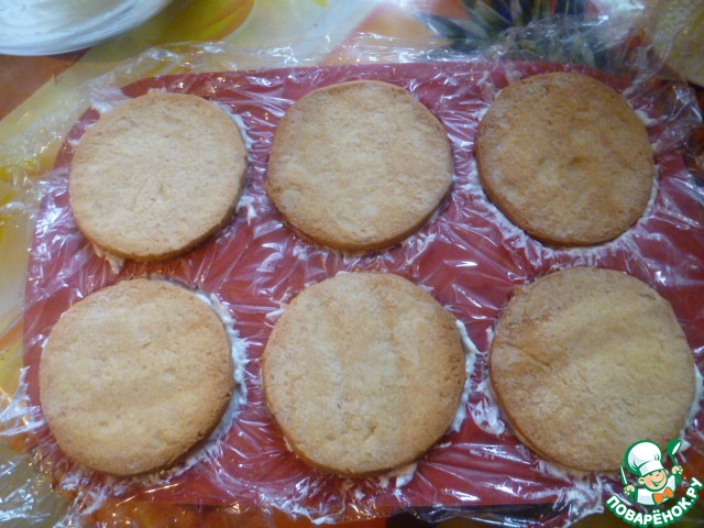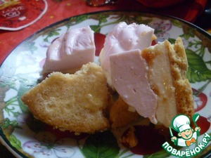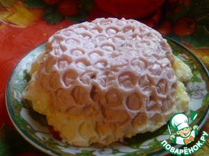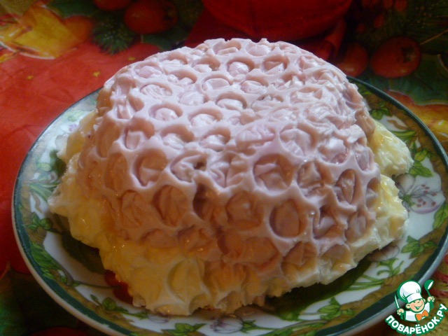 Затем снять верхнюю пленку, перевернуть на блюдо и снять внутреннюю пленку.