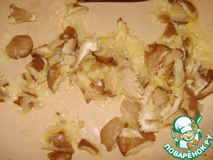 Лук репчатый и вешенки порезала, обжарила в сотейнике на растительном масле около 4 минут.