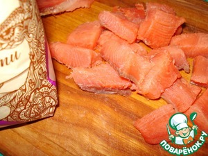 У меня была рыба копченная слабосоленая, если у вас попалась солновата, то обязательно подержите нарезанное филе кусочками минут 10 в молоке. Филе рыбы нарезала на кусочки.